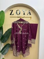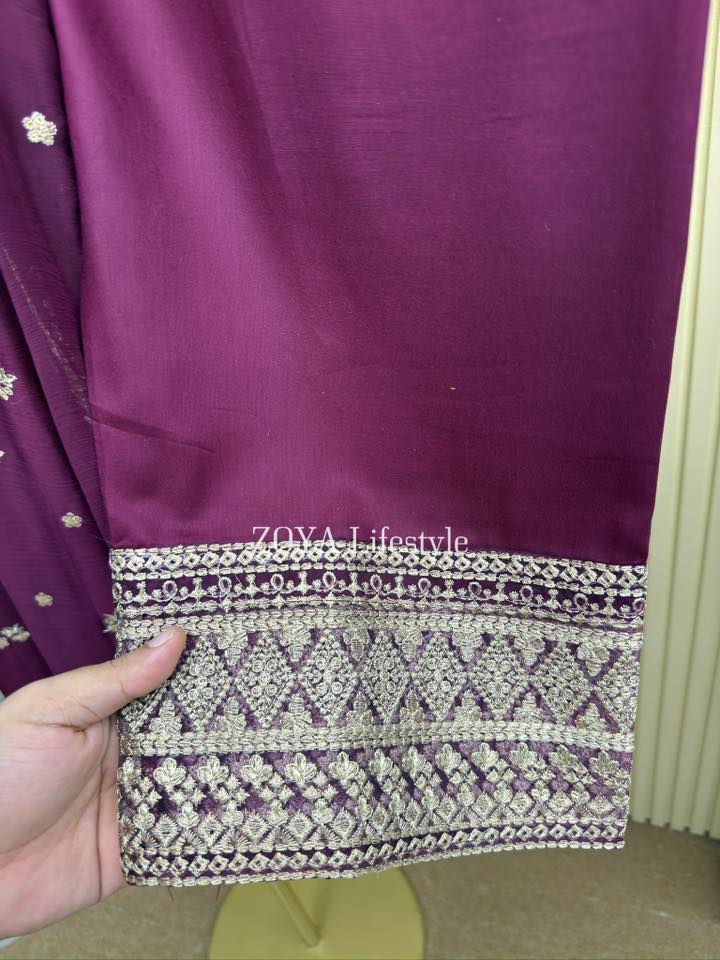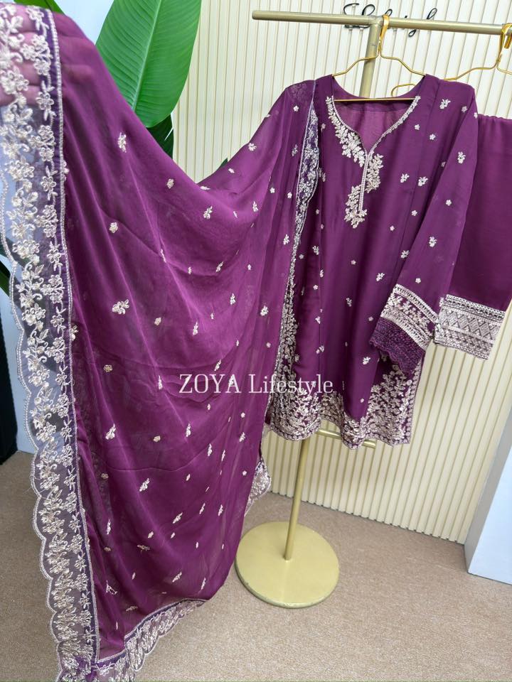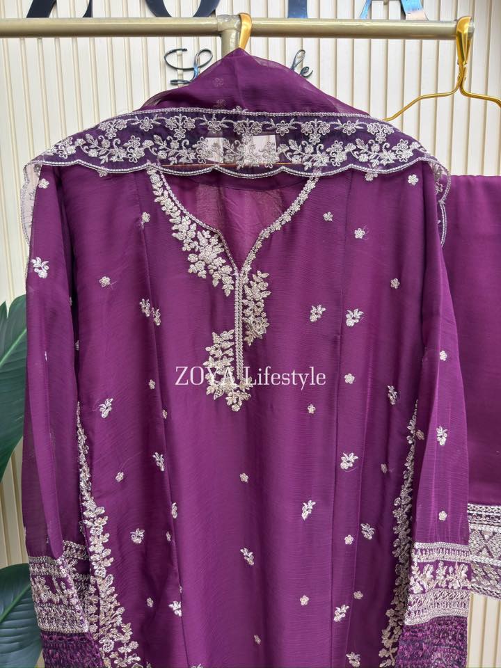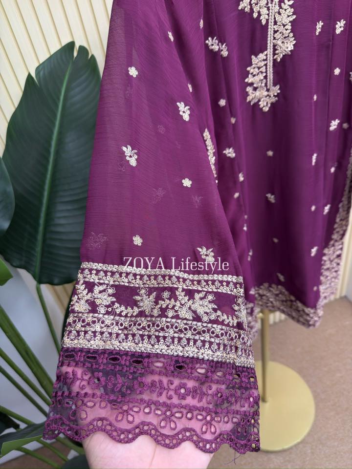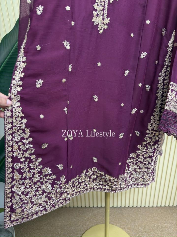 Material: chiffon with embroidery and sequins work on all over body front. Cotton mix inner attatched both side. rayon Cotton pant. Chiffon with sequins embroidered border.