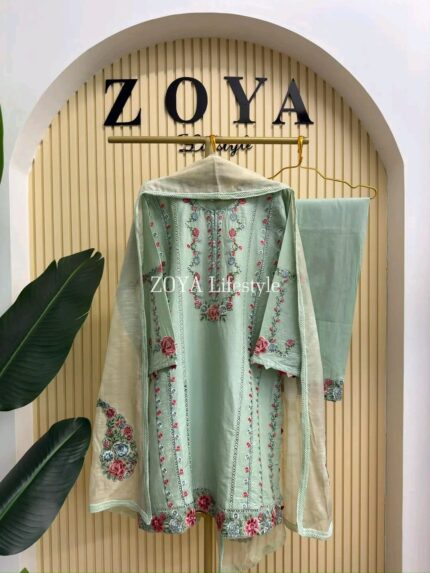 Material: Cotton with chikankari embroidery on neck. Cutworked Embroidered pannel work on sleeves and damaan. Lace work on whole body. Kota cotton printed orna. Cotton pant.