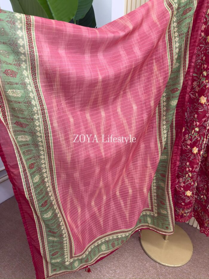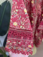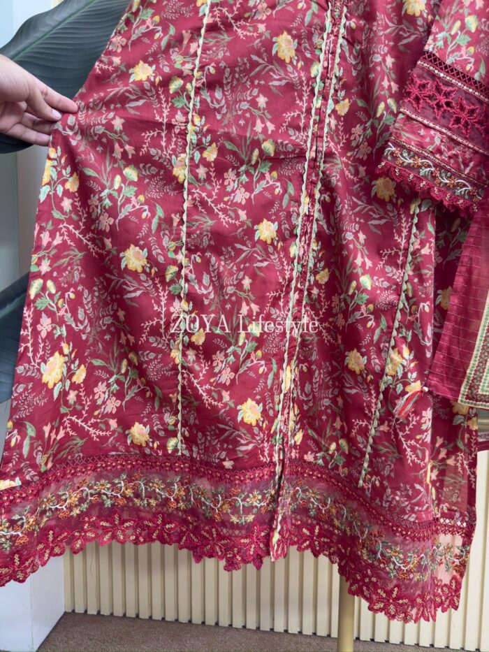 Material: Cotton with sequins embroidery on neck. Cutworked Embroidered pannel work on sleeves and damaan. Lace work on whole body. Kota cotton printed orna. Cotton pant.