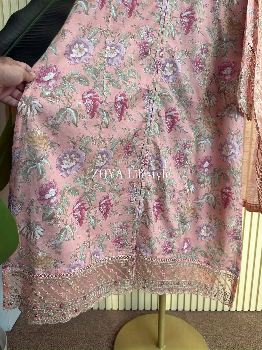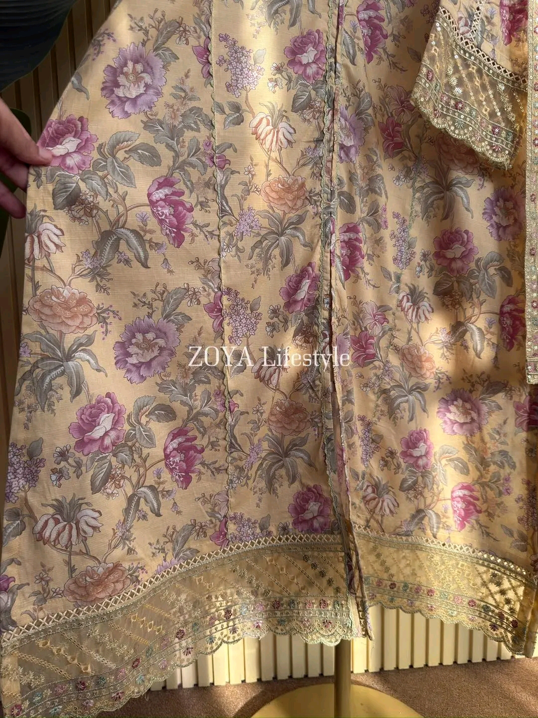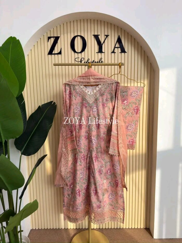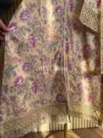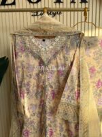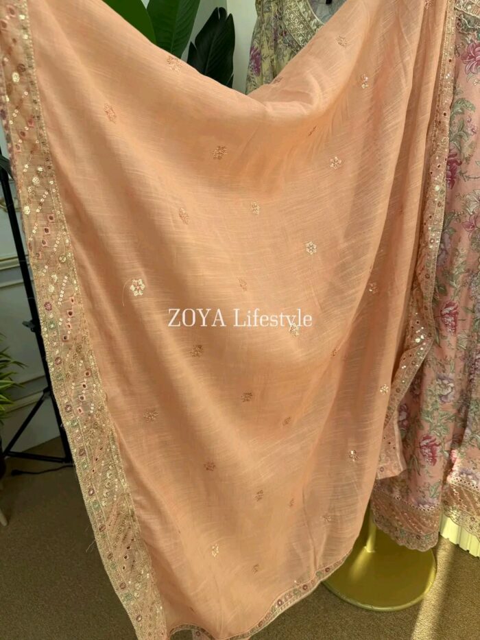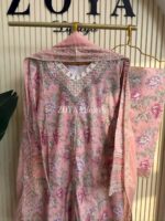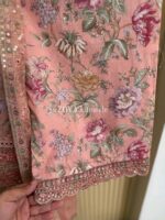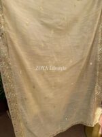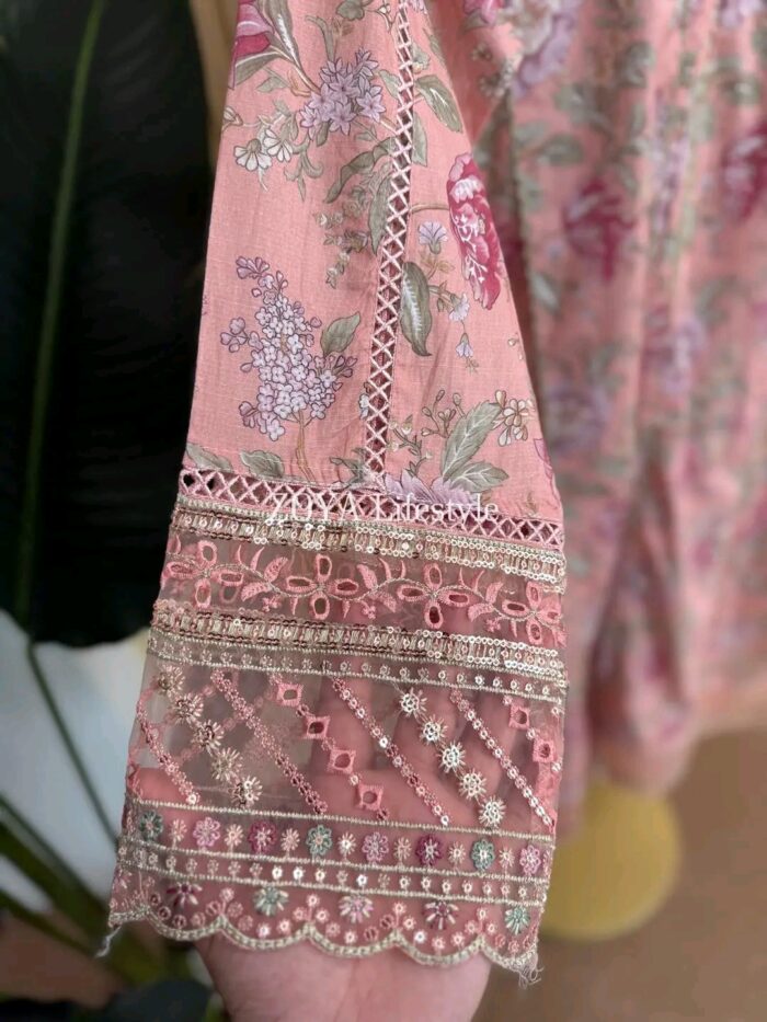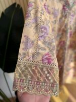 Material: Cotton with sequins embroidery on neck. Cutworked Embroidered pannel work on sleeves and front-back damaan. Lace work on whole body. Maslin cotton orna with full sequins embroidered work. Cotton pant with embroidered border.
