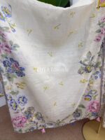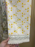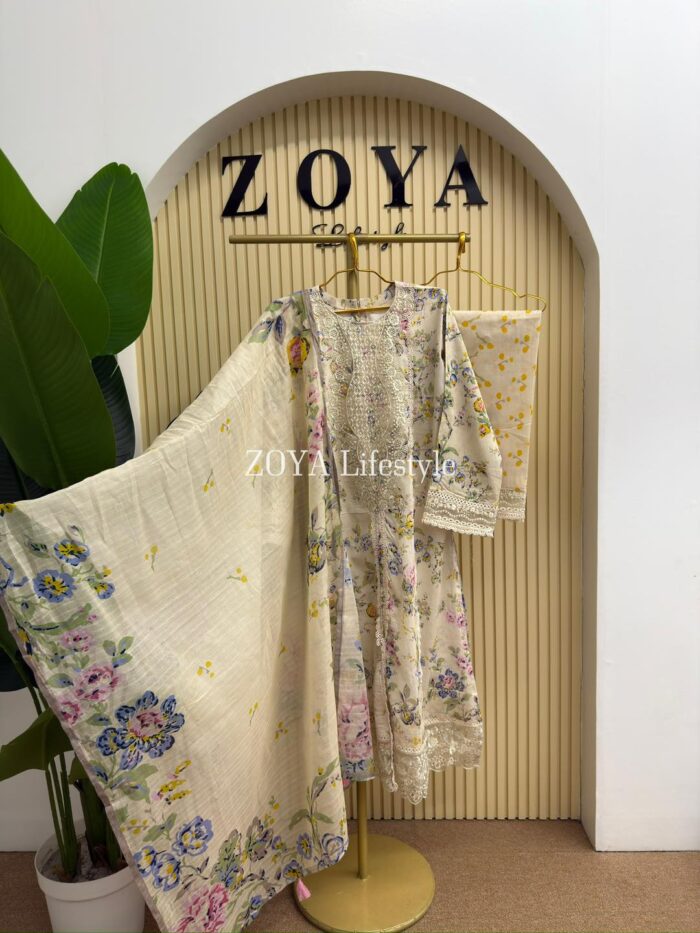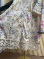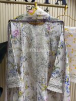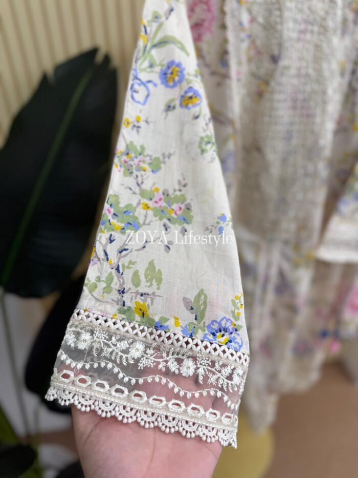 Material: Cotton with embroidery on neck. Cutworked Embroidered pannel work on sleeves and front-back damaan. Lace work on whole body. Kota cotton orna. Cotton pant with embroidered border.