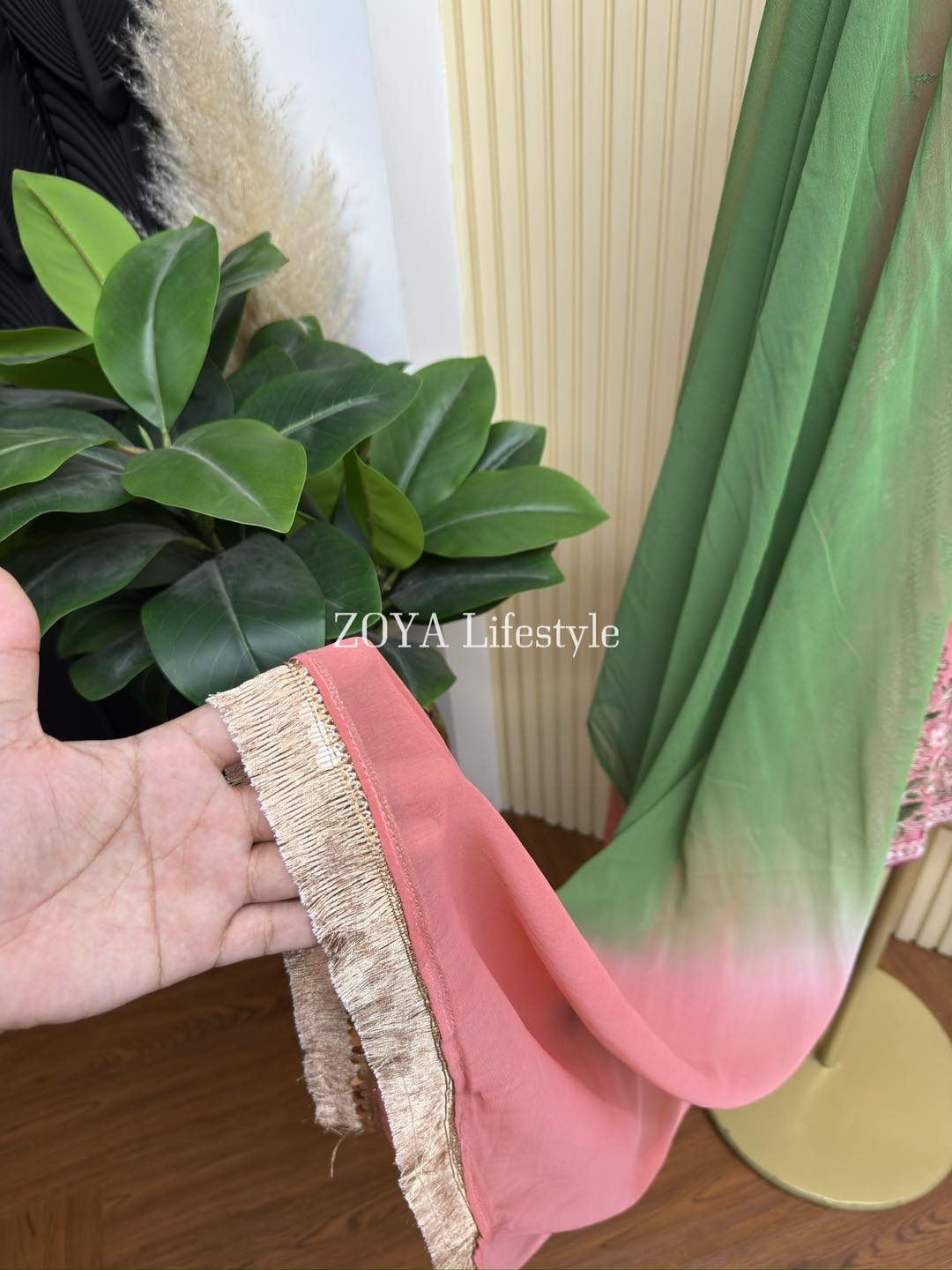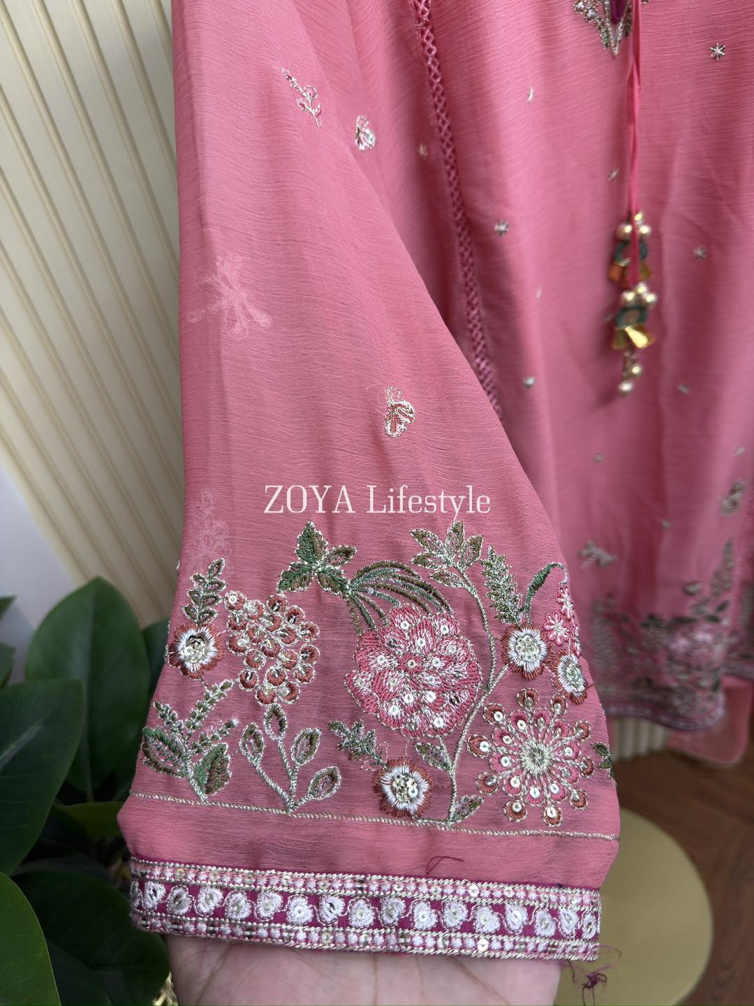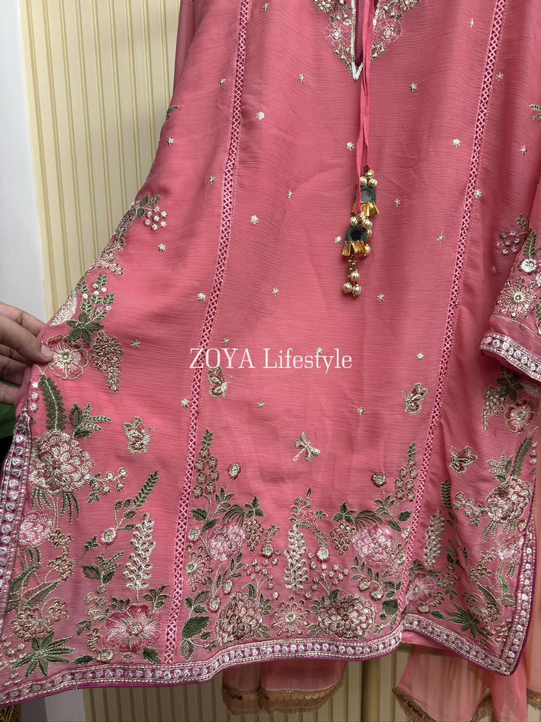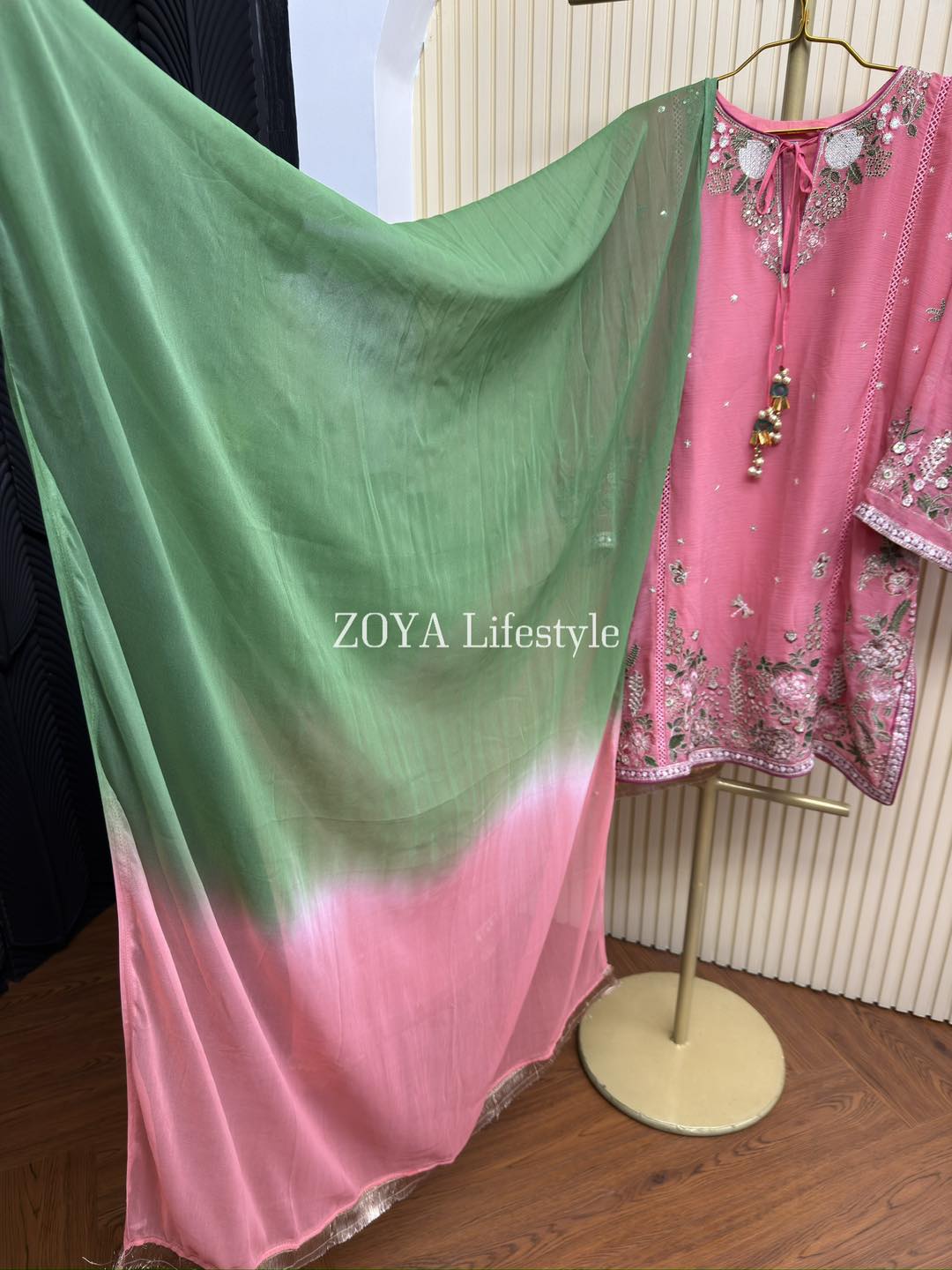 Material: Chiffon with sequins & embroidery work on all over body. Whole dress inner attached. Cotton Farshi Pant. Chiffon shaded dupatta.