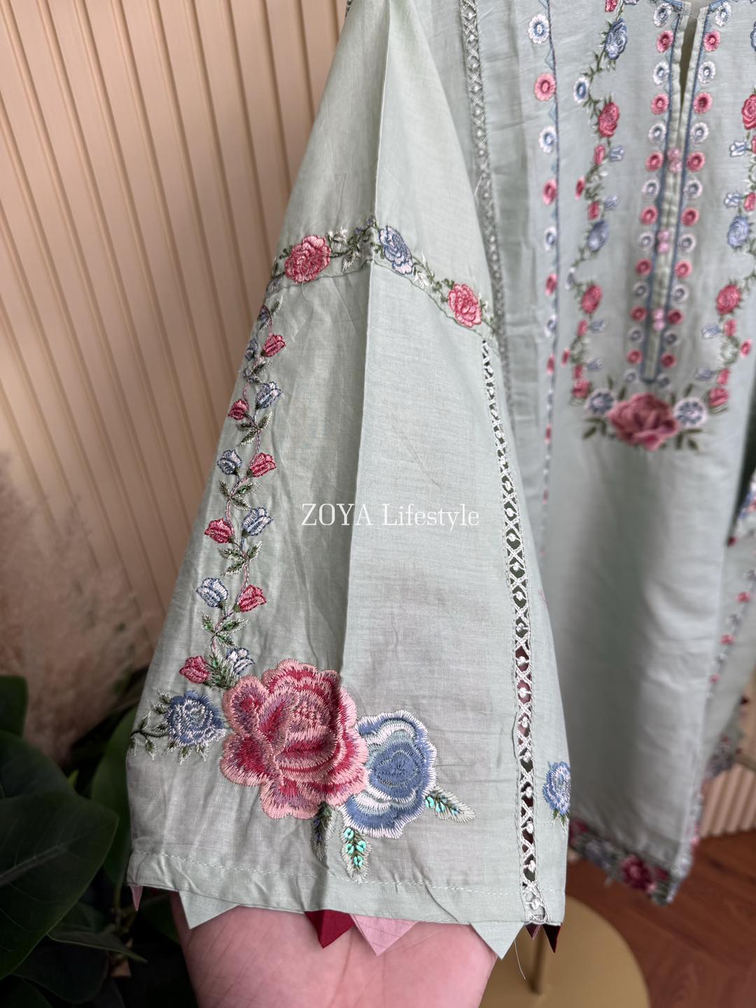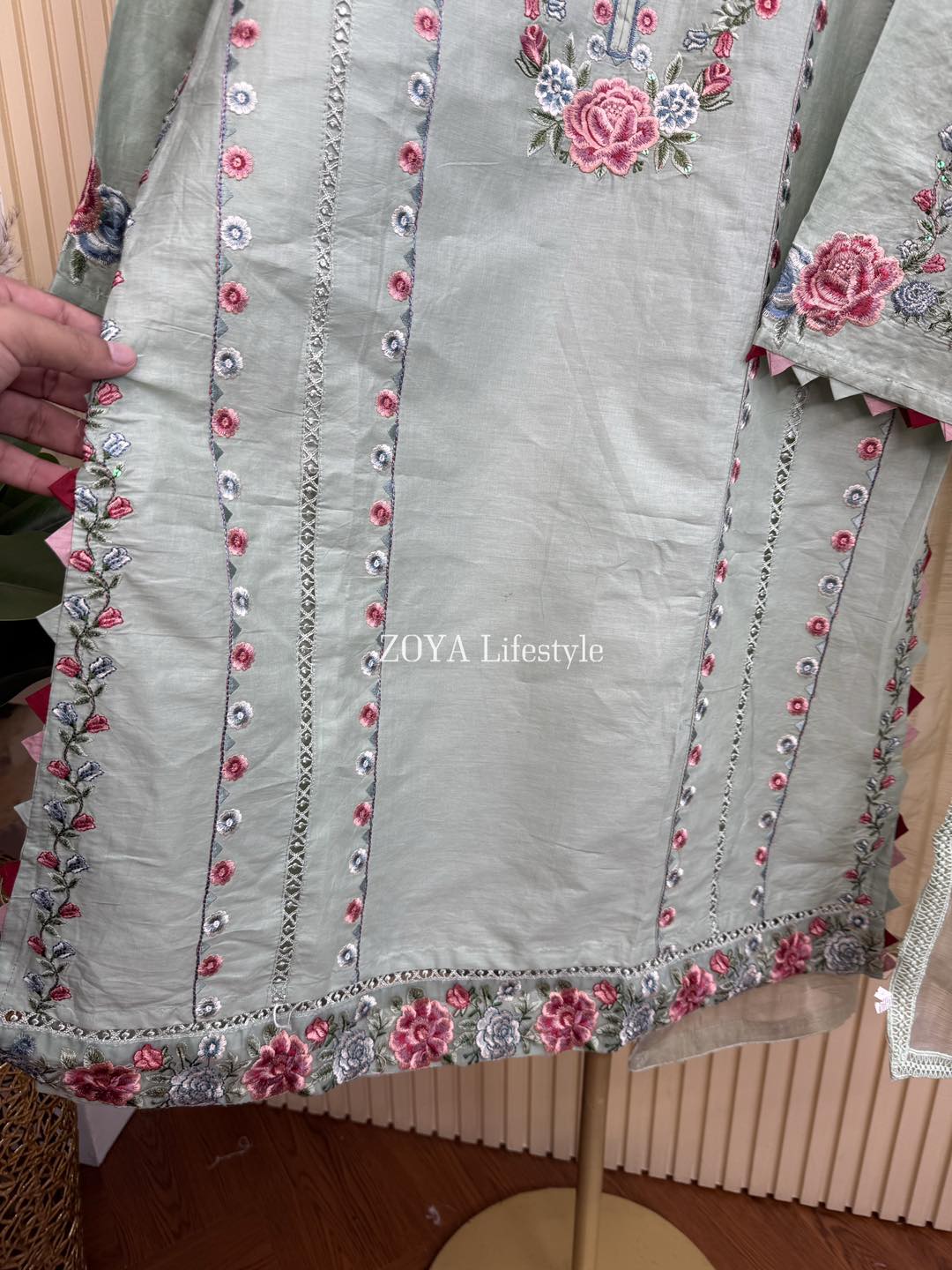 Material: Cotton with embroidery work on neck to bottom. Cotton loose pant with embroidery . Maslin kota dupatta with embroidery work.