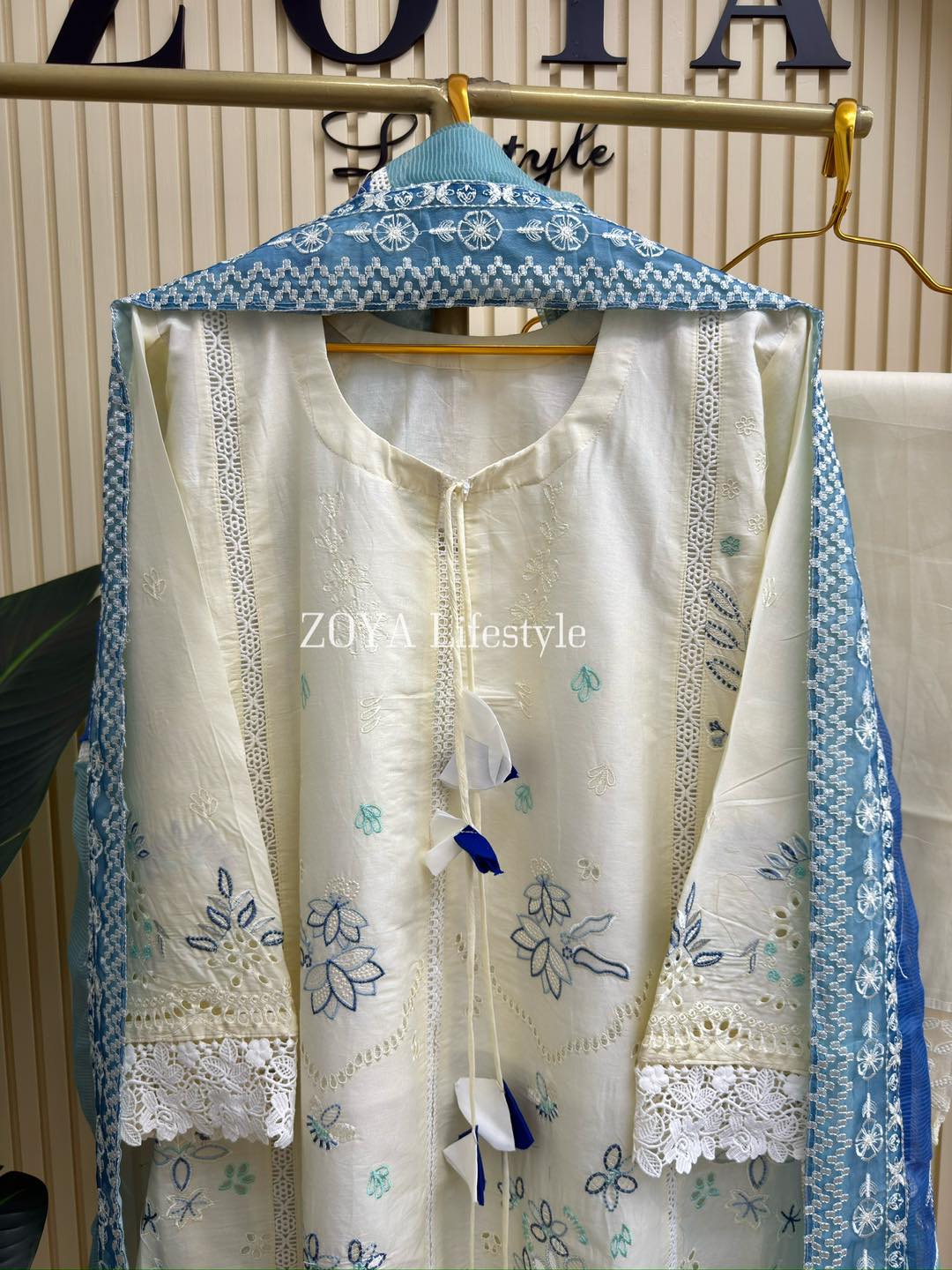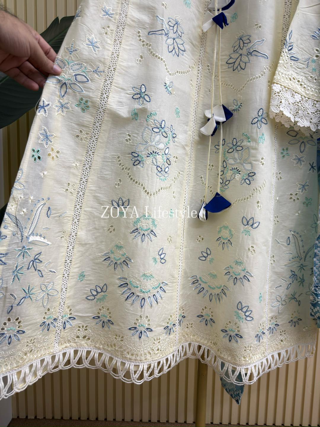 Material: Cotton kamiz with embroidery work on full body. Half body inner attached. Pant Cotton with embroidered pannel. kota embroidered dupatta.