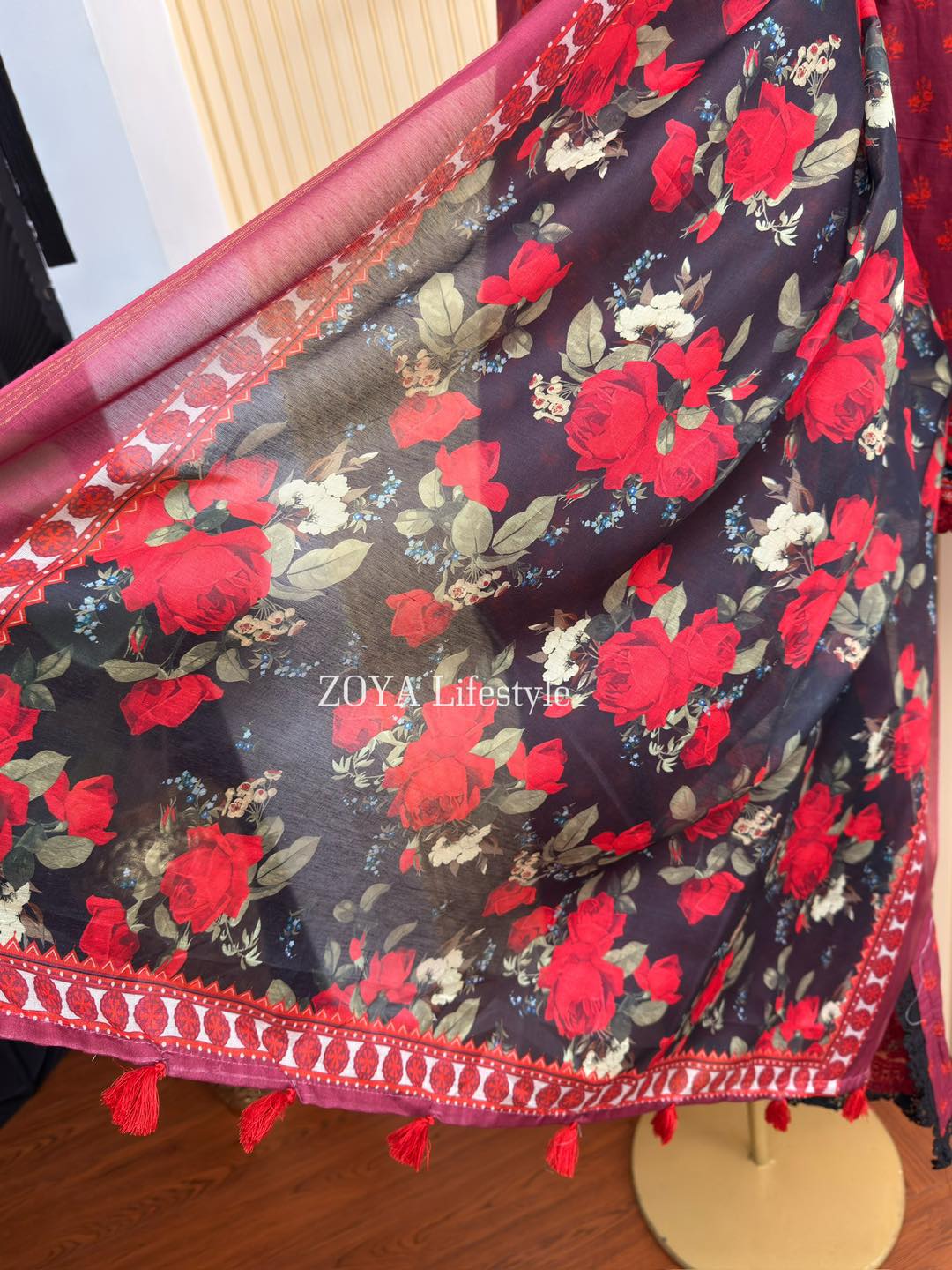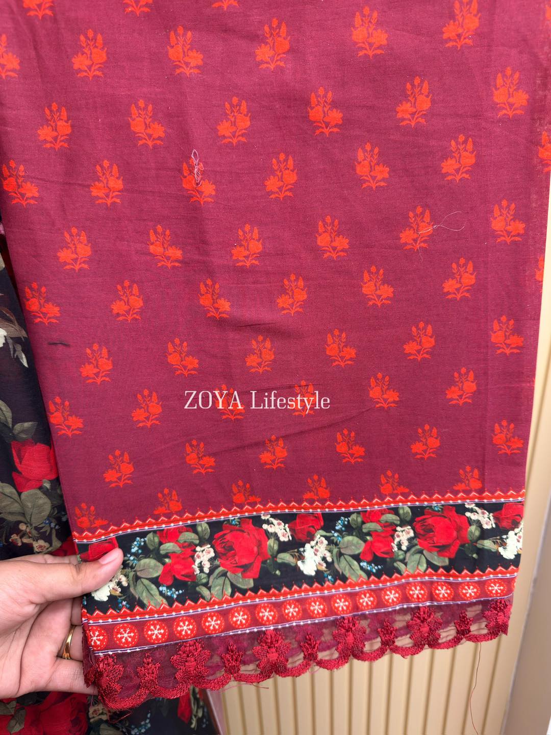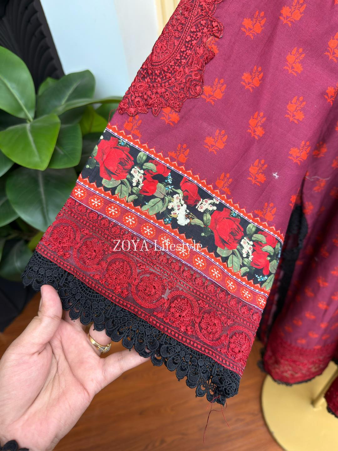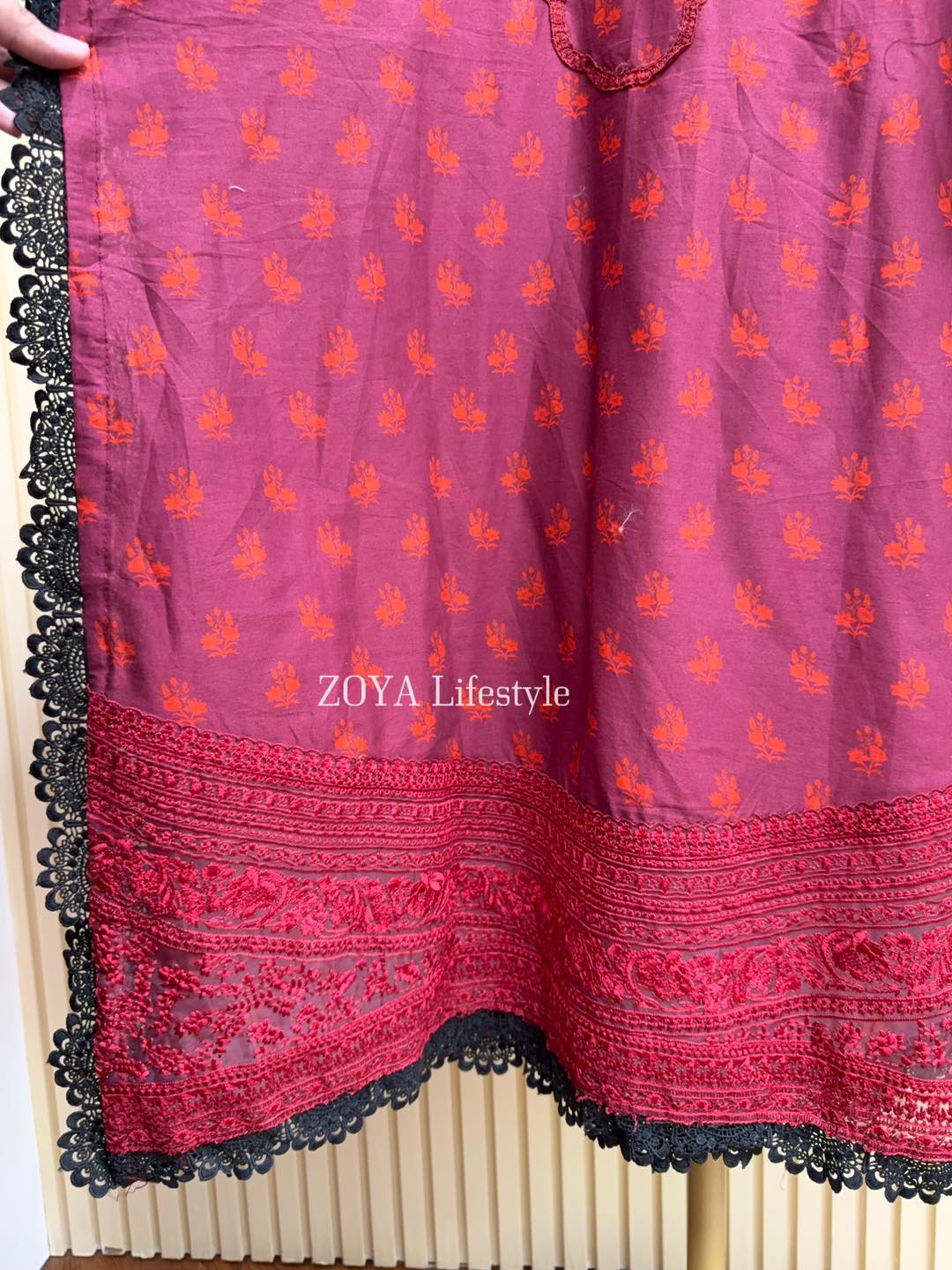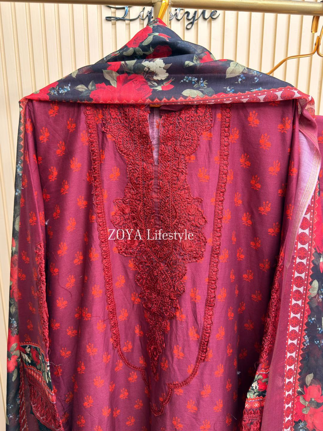 Material: Cotton kamiz with embroidery work on full front part & back part neck. Pant Cotton with embroidery work. Maisuri silk cotton dupatta.